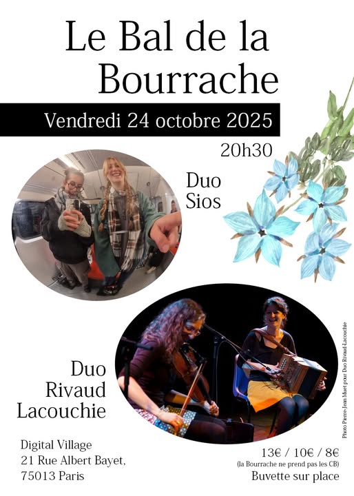 - (bal) Paris 13ème, Digital Village, 21 rue Albert Bayet, 20h30: bal avec le Duo Sios et le duo Rivaud/Lacouchie (info) (info)