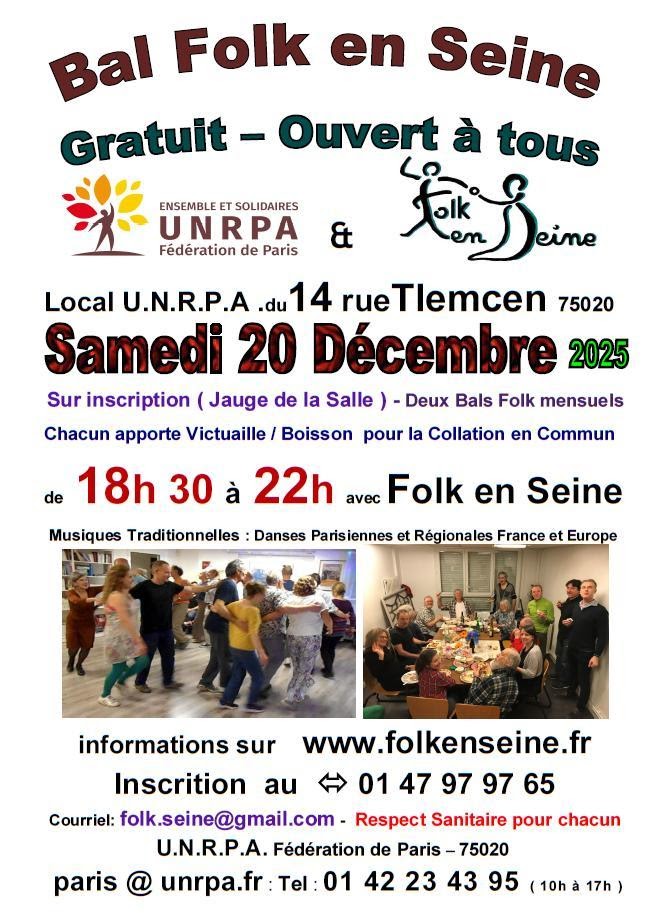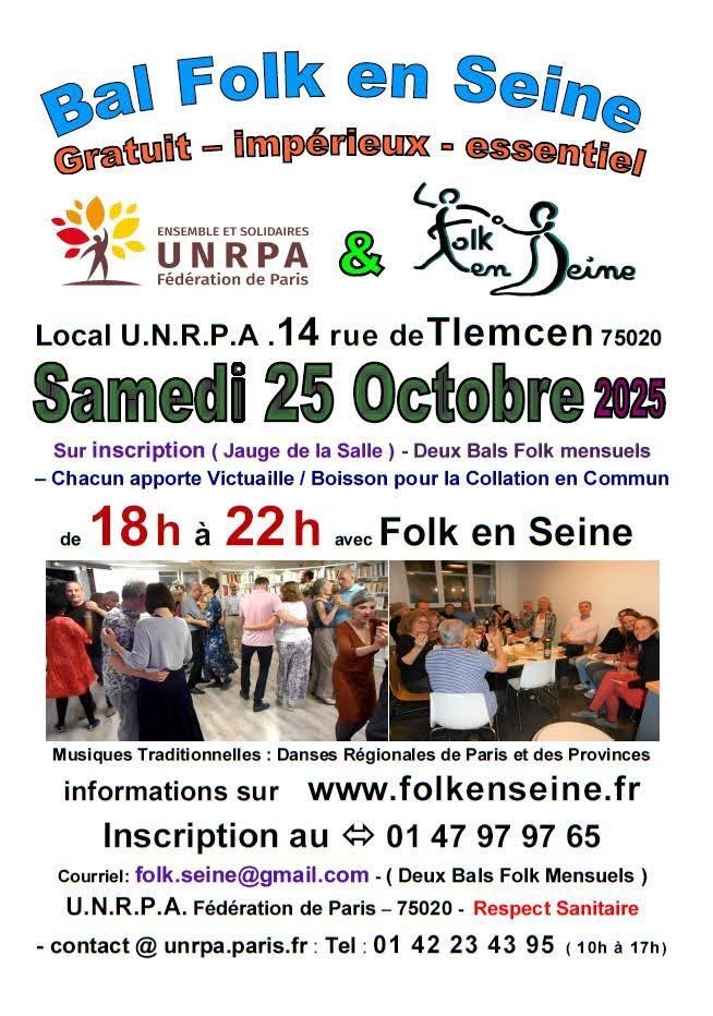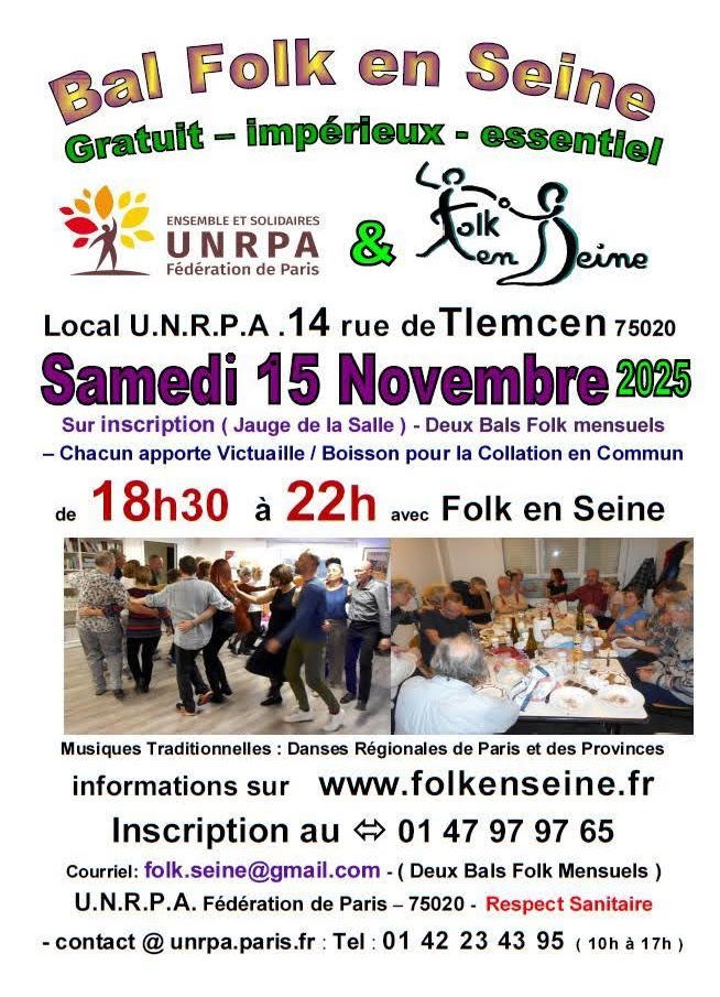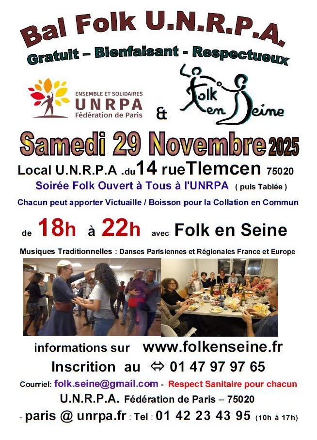 - (bal) Paris 20ème, UNRPA 14 rue de Tlemcen, 18h30-22h: bal folk avec Folk en Seine (info) (info)