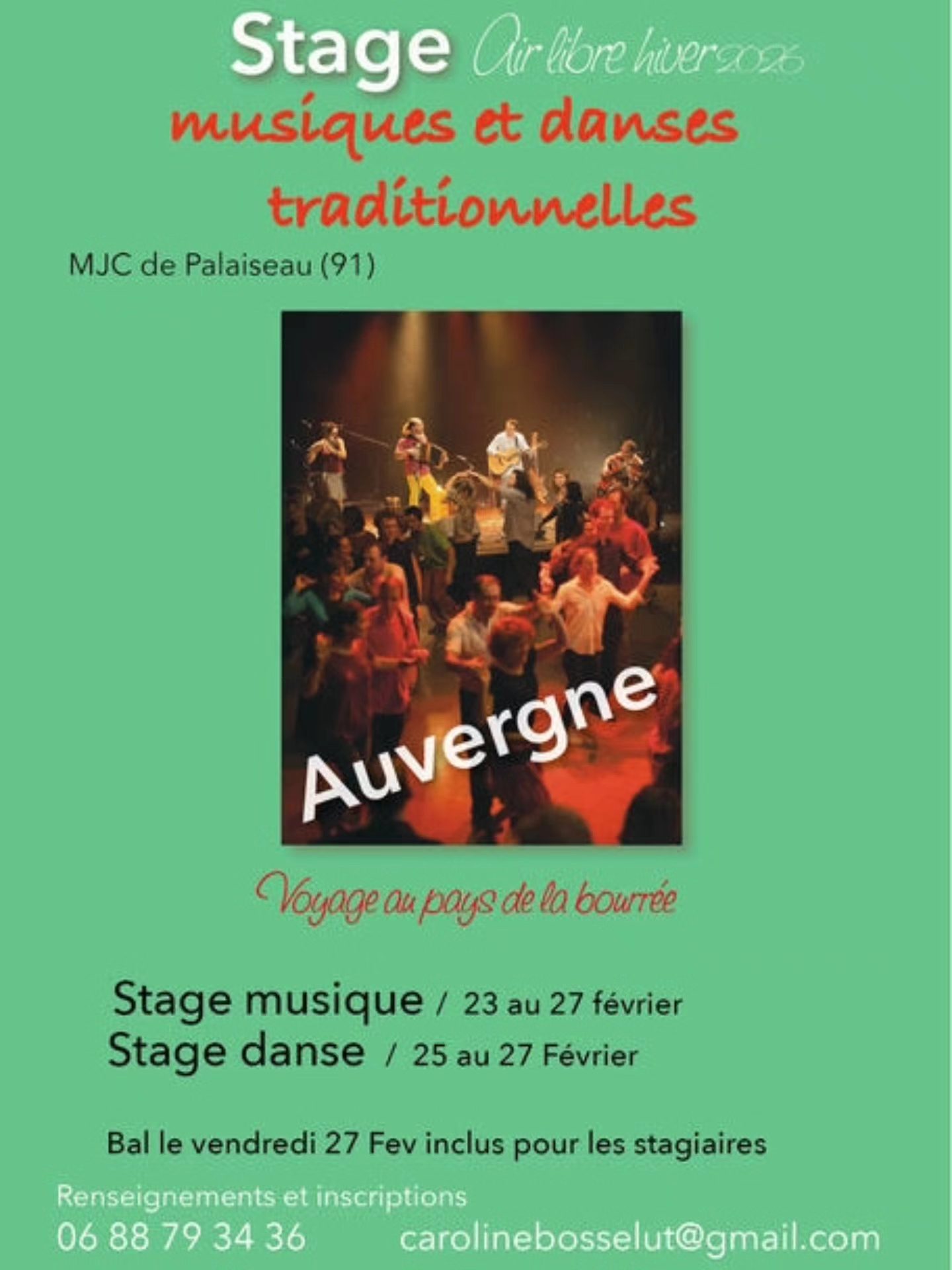 - (stage) Palaiseau (91), MJC, parc de l'Hotel de Ville, du 23 au 27 février: stage musique Auvergne avec Loic Etienne, Olivier Sulpice, Emma Cousteix (affiche) (info)