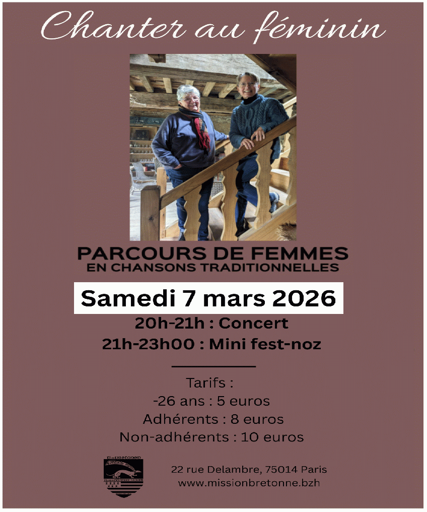 - (bal) Paris 14ème, Mission Bretonne, 22 rue Delambre, 20h-2h: concert Chanter au féminin puis mini fest-noz (affiche)