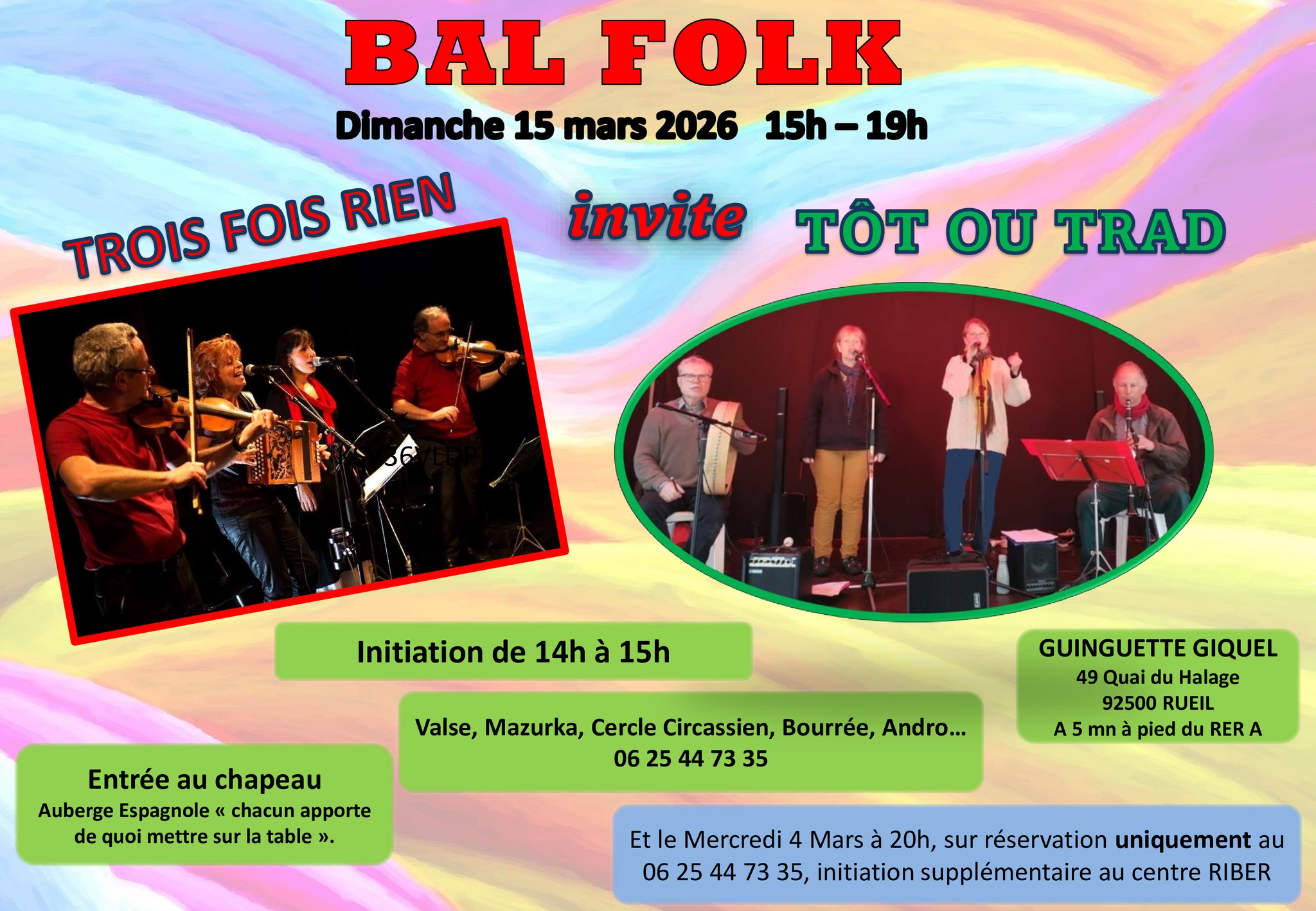 - (bal) Rueil-Malmaison (92), Maison Giquel 49 Quai du Halage, 15h-19h: Trois fois rien et invités Initiation à 14h. Entrée au chapeau, auberge espagnole, boeuf à la fin du bal