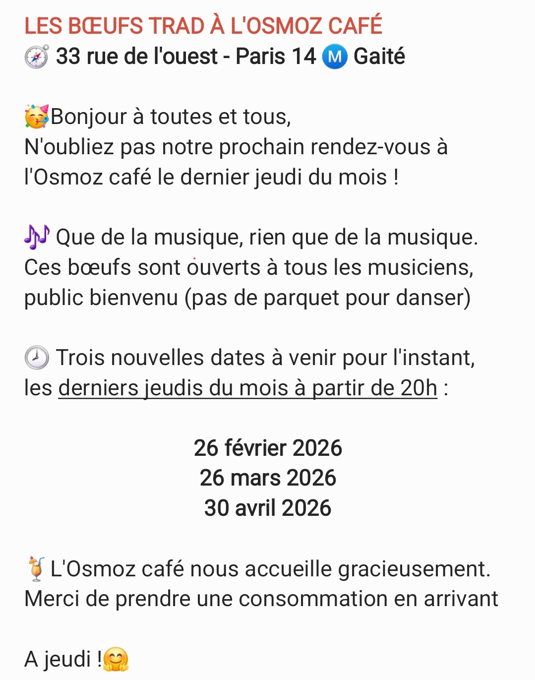 - (bal) Paris 13ème, Digital Village, 21 rue Albert Bayet, 20h30: bal avec le duo la onzième heure (Alexandra/Ludo) et Trad'Ouir (lien Facebook)