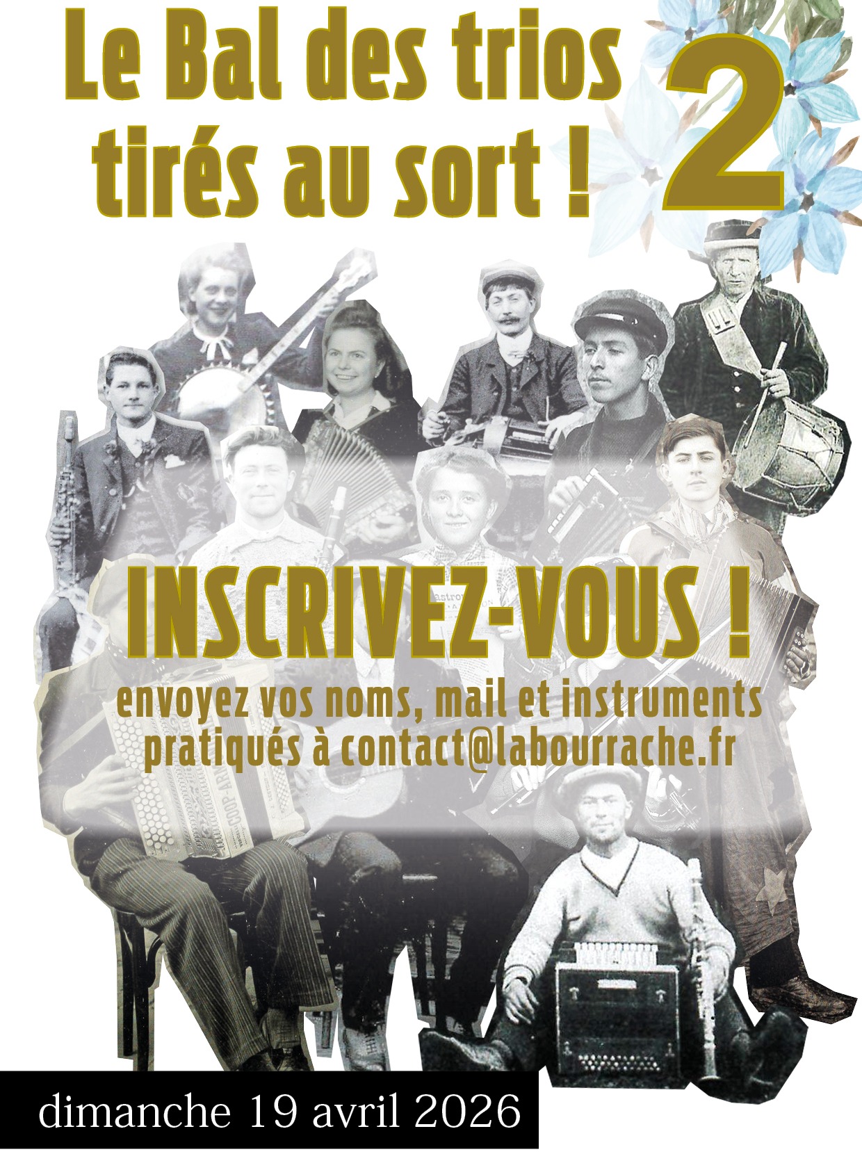 - (bal) Paris 14ème, Mission Bretonne 22 rue Delambre, 15h-20h: bal des trios tirés au sort Tirage le 13 février Inscription: contact@labourrache.fr (affiche)